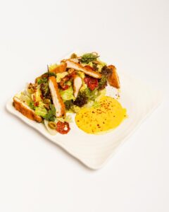 میکس کاهو،زیتون،گوج خشک،گردو،مرغ سوخاری،سس خردل و عسل،پنیر پارمزان