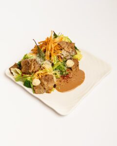 میکس کاهو،پنیر مزه دار شده،پنیر مدادی،کرن بری،زرشک،بروکلی،نان سرخ شده،گوشت استیک، سس سربینو،پنیر پارمزان