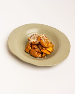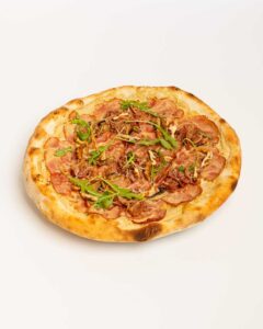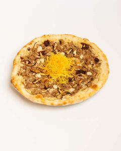 سس بادمجان کبابی،پنیر پیتزا،گوشت پولدبیف،قارچ،پیاز کاراملی، چیپس دست ساز