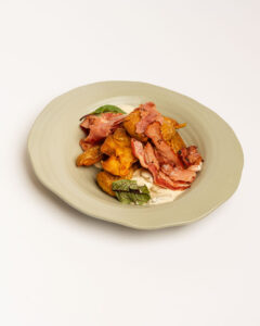 سیب زمینی دست ساز،سس قارچ،بیکن،ادویه مخصوص، پنیر پارمزان