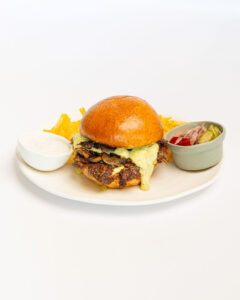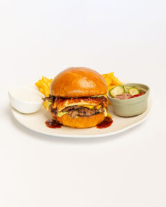 ۲۰۰ گرم گوشت کوهان گوساله، نان برگر دست ساز، پنیر دودی، سس هات هانی باربیکیو، چیپس دست ساز
