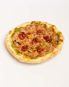 سس پستو، پنیر پیتزا، ران بوقلمون دودی، قارچ، گوجه خشک