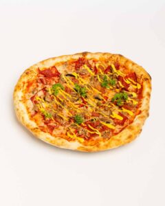 سس مارینارا، ژامبون گوشت و مرغ،چوریتزو،گوشت چرخکرده،قارچ،فلفل دلمه، زیتون،سس پنیر