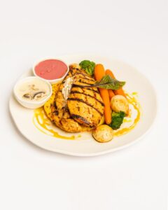 پوره سیب زمینی،سینه مرغ گریل شده،دورچین سبزیجات،پنیر مزه دار شده،سس قارچ،سس زرشک
